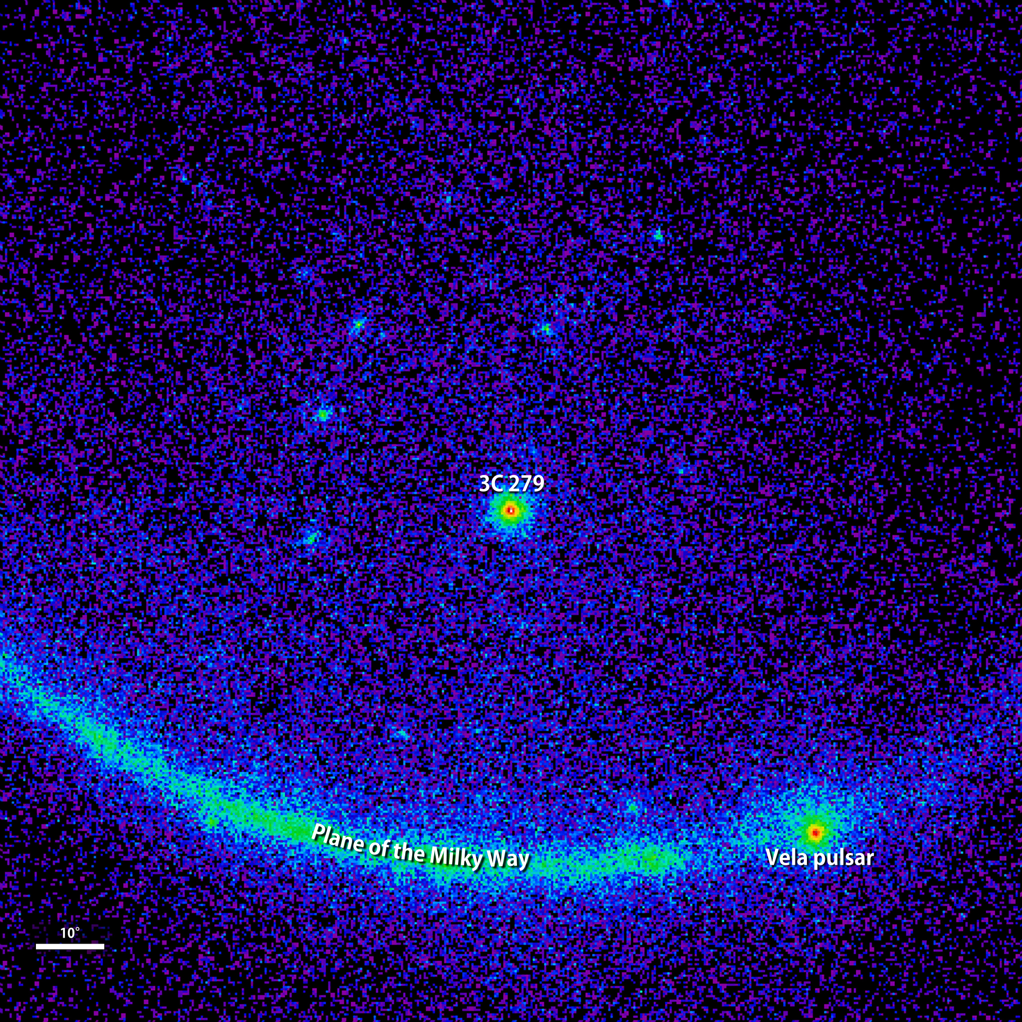 On June 14, record-breaking high energy light was detected by sensors on NASA’s Fermi Gamma-ray Space Telescope. This event was caused by a disturbance, 5 billion years ago, near 3C 279’s supermassive black hole and it’s just reaching us only recently. The flare was so powerful that it was four times brighter than the brightest constant source under gamma-ray observation, the Vela pulsar, a very magnetic neutron star, left from a massive supernova, that beams gamma rays. To further contextualize the flare’s tremendous energy, the Vela pulsar is about 1,000 light years away and 3C 279 is millions of times further from us than that and produced greater brightness.