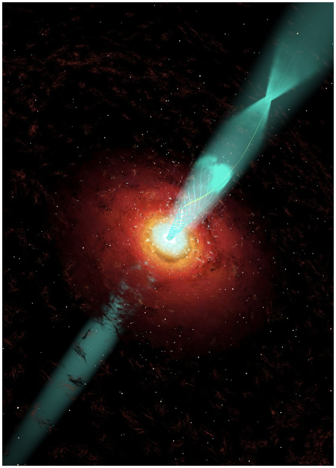 3C 279 is what is known as a blazar, a large active galaxy with a supermassive black hole at its center. Blazars tend to be some of the most energetic systems observed in the Universe. 3C 279’s supermassive black hole is a billion times more massive than our Sun and when various space objects fall towards its ‘entrance’ or event horizon, some particles are channelled through extremely powerful jets on opposite sides. One of these jets is pointed right towards Earth and this allows us to detect the resultant energy flares.