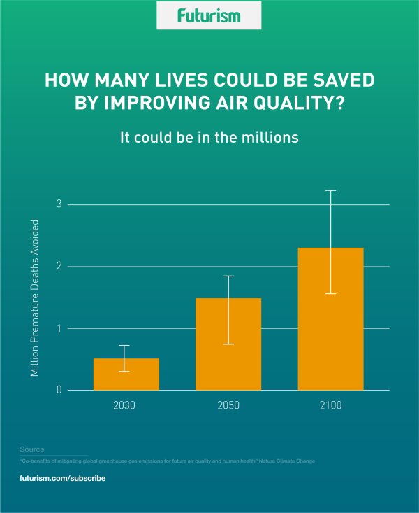 Kicking the fossil fuel habit would also mean fewer heat-related deaths — and this is highly significant. The 2003 heatwave in Europe caused an estimated 70,000 deaths, and the 2010 heatwave in Russia killed 15,000. By 2100, heatwaves could threaten almost three-quarters of the world’s population.