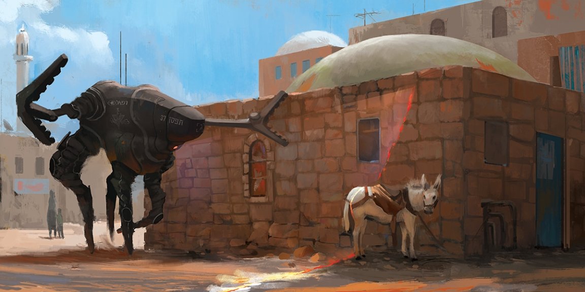 Throughout Pavel’s visions of the future, we can see a repeated pattern: the technological prowess of the West is going to collide with the simple lifestyle of natives. Since the images depict the Israeli army, it’s obvious why the machines are essentially fighting or constraining the Palestinians. You can see in the images below what life might look like in 2048 for Arab civilians and combatants.