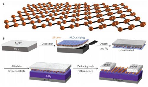 - To get the nanosheets to cooperate the researchers first grew some sheets of it on a very slim base of silver that had been topped with aluminum oxide. Once grown, the silicene sheet was peeled off its base and placed silver side up on a silicon dioxide wafer. The silver was then fashioned to make electrical contacts allowing the sheet to be used as a transistor.