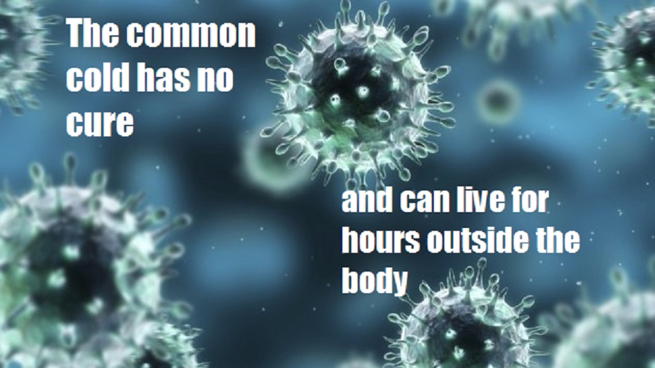 However, handshakes aren’t the easiest forms of transmission. Ultimately, sneezing and coughing are the best chance a virus has of getting into a new host. When a person sneezes or coughs they “aerosolize” their saliva, as well as mucus from inside the nose and throat. Literally, they create a mist of infection coating their surroundings. But don’t fear, not every surface you touch is infected with these nasty viruses. Viruses similar to Rhinovirus only live about 3 hours outside of the body, and generally can’t reproduce. Frequent hand washing (with water and soap) is usually enough to remove the viruses from the skin.