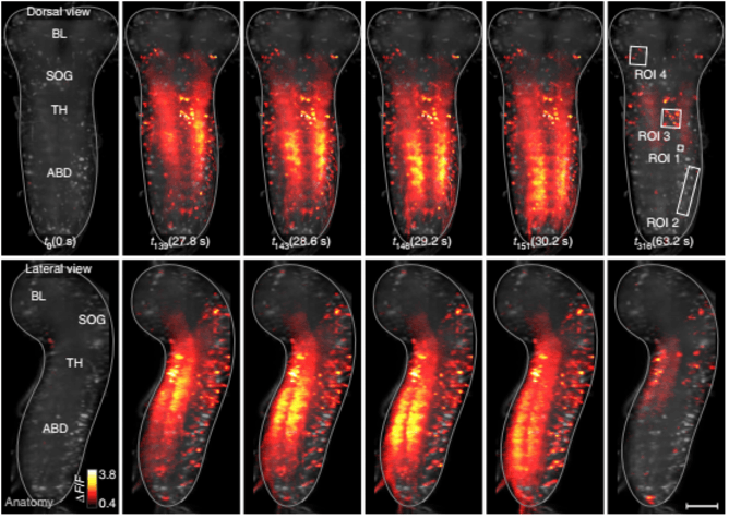 - Using the new equipment, the researchers were able to capture more than 10,000 neurons firing in Drosophila larvae while the central nervous system was artificially excited in patterns that mimicked crawling backward and forward.