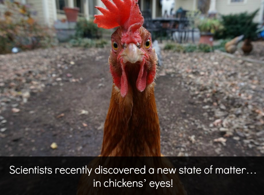 Of course, the aforementioned are generally only found in the distant reaches of the cosmos, far from Earth. But there are forms of matter on our planet that do not fit into the four traditional categories. Case in point, scientists recently discovered a new form of matter that exists, in all places, in the eyes of chickens.