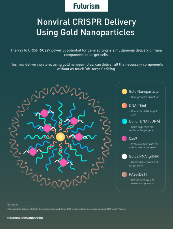 The assembly, dubbed CRISPR-Gold, was then coated in a polymer that’s capable of triggering endocytosis, which helps the Cas9 protein, guide RNA, and template DNA abscond from the endosomes inside cells.