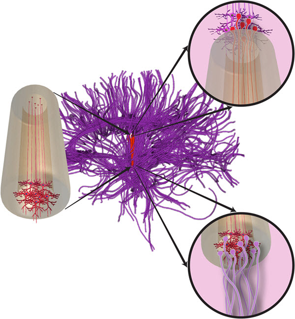 The authors were able to accomplish this by applying an ultra-thin coating of a gel commonly found in biomedical products to the micro-TENNs. This allowed for the insertion of the micro-TENNs without the use of a needle. More technically, they used molded cylinder of agarose (a sugar) that they filled with an extracellular matrix wherein axons and their connected neurons could grow in the cortex region and the thalamus.