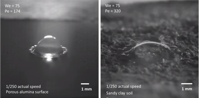 Using high-speed cameras, the researchers observed that when a raindrop hits a porous surface, it traps tiny air bubbles at the point of contact. As in a glass of champagne, the bubbles then shoot upward, ultimately bursting from the drop in a fizz of aerosols. The team was also able to predict the amount of aerosols released, based on the velocity of the raindrop and the permeability of the contact surface which may explain how certain soil-based diseases spread.