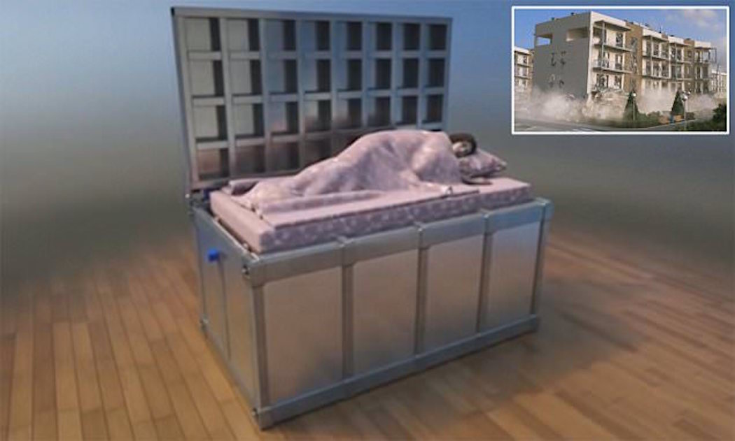 The mechanism is designed to protect occupants by letting the mattress drop into a hollow chamber with a strong, protective lid once it is triggered by sensors. Once safely inside, you can peacefully wait for the shaking to stop with supplies (the chamber can easily accommodate an ample stock of emergency supplies) until help arrives.