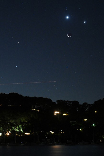You can see more amazing images of men in the Moon, faces on Mars, and celestial space beasts by visiting this article (don’t worry, none of these monsters are actually real). Also, please note: The below image has been making the rounds recently (which is partly what prompted this post). The image in question is, in fact, fake. You can tell because both Jupiter and Venus looks exactly the same. Also, the conjunction was in 2008, not 2010. Although a conjunction like this did occur in 2012, Jupiter and Venus were much farther apart and much farther from the Moon. I believe the images that shows the three at their closest (and which are reliable and accurate) are those posted here.