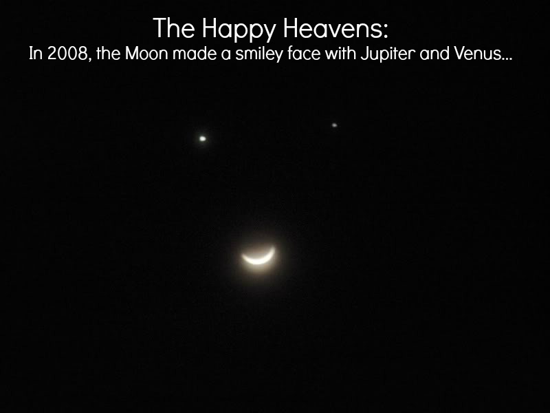 In 2008, the world witnessed a rare event: The conjunction of the Moon, Venus, and Jupiter. A conjunction occurs when planets align in the sky; however, this event was notable and rare, not because the planets aligned, but because of the way that they aligned. Looking at these images, it is extremely easy to see a smiley face. This is known as “pareidolia.” In essence, “pareidolia” occurs when one sees meaningful images in random data. It is a rather common phenomenon, especially in relation to astronomy. Think about the man in the Moon or the face on Mars; they are neat tricks of the eye, but nothing more. Ultimately, pareidolia does not signify anything, it is just our brains interpreting data in interesting ways.