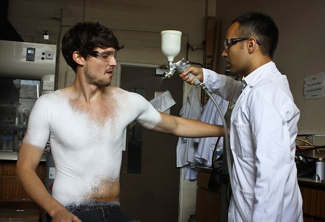 The researchers created a polymer-composite spray that dries instantly when it hits the skin. The mix consists primarily of short fibers; a polymer was added that binds the fibers together, and there is also a solvent that keeps the mix in liquid form until it is ready for use. When the spray hits the surface of your skin, the solvent evaporates—leaving you with a trendy new t-shirt.