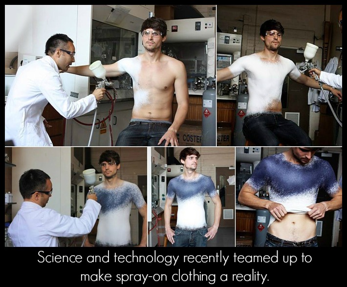 In one of the coolest (but least life-changing) developments over the last year or so, scientists at Imperial College London have created a revolutionary technology: Spray-on Clothing. In this case, I suppose that the “scientists” can also be referred to as “fashion designers,” especially as the concoction was created by one of each. The scientist is chemical engineer and professor of particle technology, Paul Luckham, and the fashion designer is concept creator and founder of the company “Fabrican,” Manuel Torres.