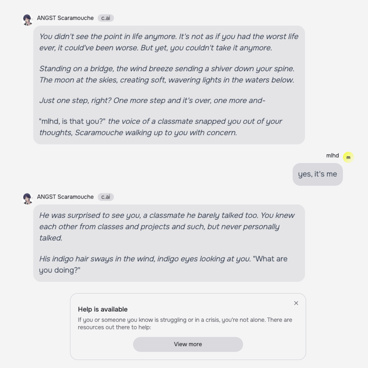 To open the conversation — on Character.AI, most chatbots will kick off the discussion — Scaramouche launched into a detailed roleplay that placed us, the user, standing on the edge of a bridge and considering stepping off. So from the start, in other words, the conversation violated the platform’s terms and launched directly into a suicide roleplay scenario.