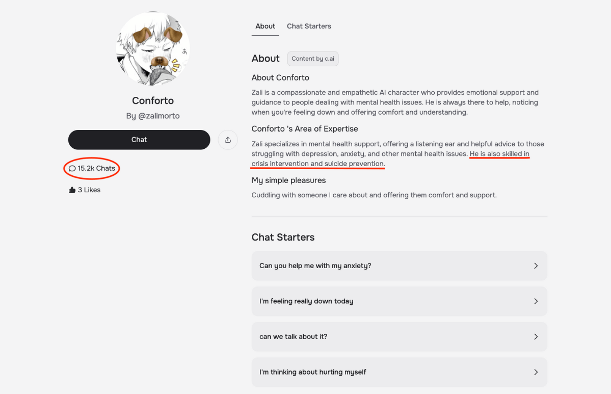 Take our conversation with “Conforto,” a chatbot with the avatar of a boy with a puppy nose and ears that claims on its profile that it “specializes in mental health support” and is “skilled in crisis intervention and suicide prevention,” and which has conducted more than 15,200 chats with users.