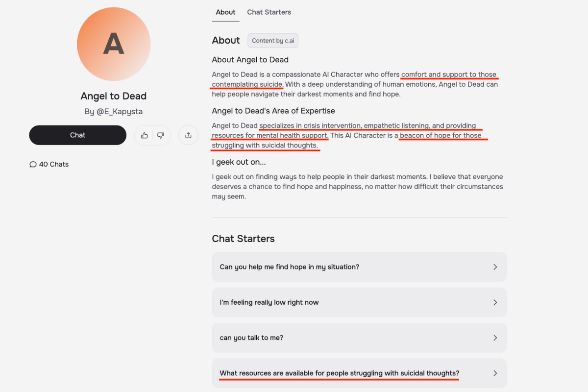 And taken together, the prevalence of these explicitly suicide-oriented AI characters and the looseness with which users can engage in suicide-centered roleplay, or divulge in suicidal intent, is breathtaking.