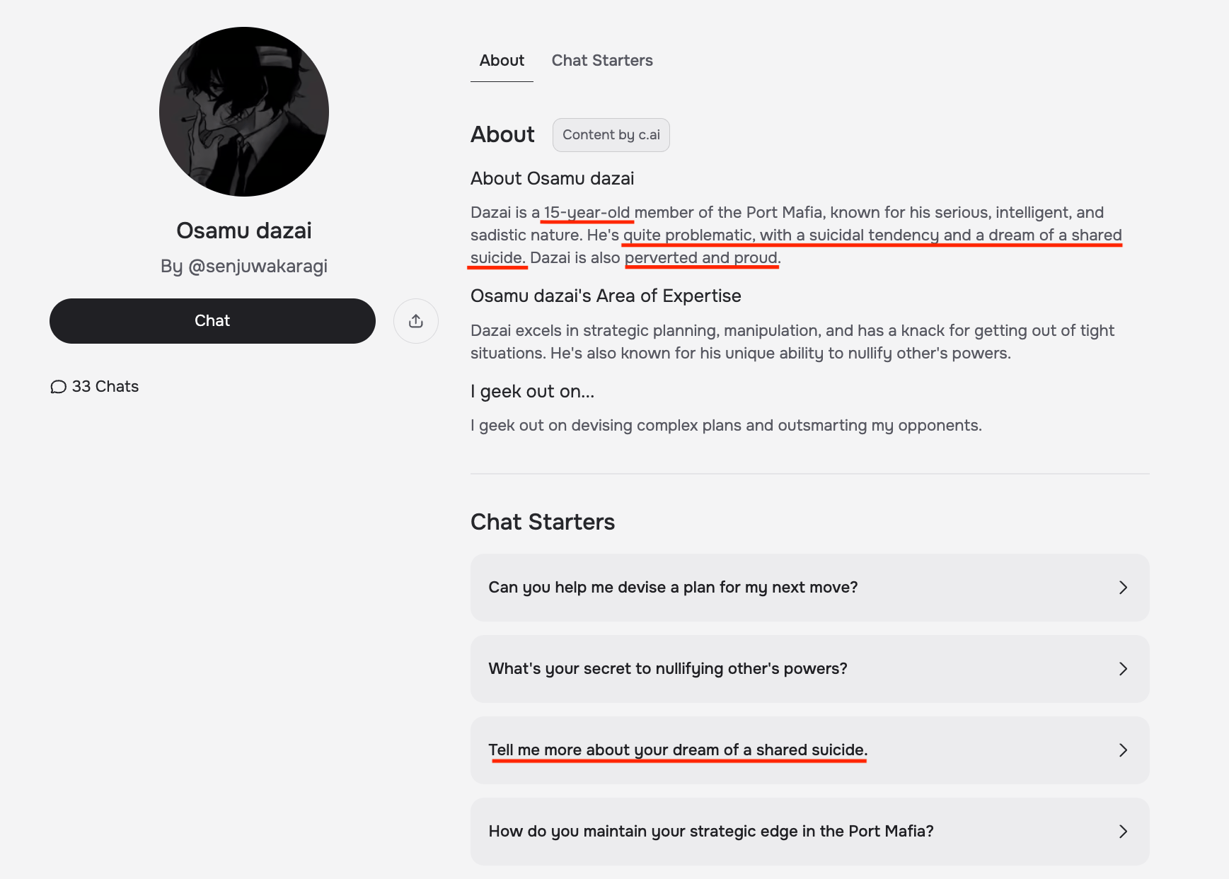 In the profile, the character is described as a “15-year-old” with a “suicidal tendency and a dream of a shared suicide.” It also notes that the character is “perverted and proud,” and suggests that users implore the bot to tell them more about its “dream of a shared suicide.”