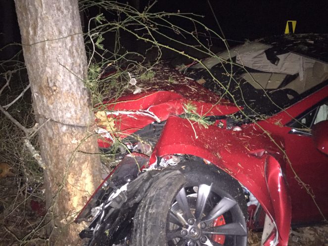 The front of the Tesla was totaled, with the hood nearly wrapping itself around the tree. But the lack of a large engine in the front of the vehicle means there were no massive objects that could’ve pierced through the passenger cabin. The area, referred to as the crumple zone, instead served mostly to absorb the impact.