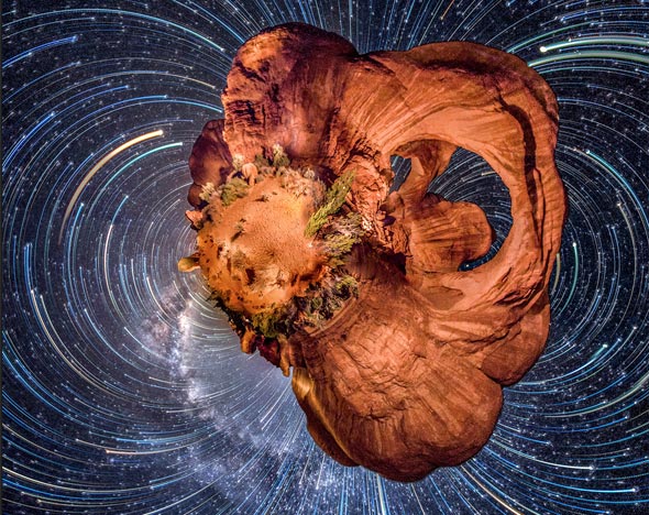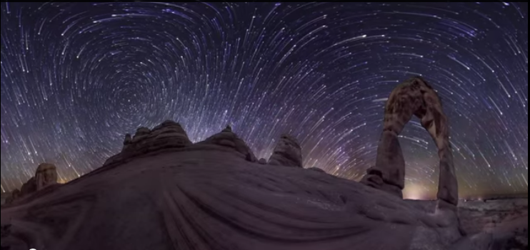 According to Brady, he used a four camera rig to capture the footage, each aimed at its own section of sky. “Since the Earth is rotating at a steady 1,040 mph I created a custom rig of 4 cameras with fish-eye lenses to capture the entire night-sky in motion,” he remarked, “Thus the images show the stars rotating around the north star as well as the effect of the southern pole as well and a 360 degree panorama of the scene on Earth.'” (sic) Once the rigs were mounted, they recorded each shot for about a minute, capturing up to 300 images over the course of a few hours, or until the batteries were depleted. Later on, he even developed his own software to carry out the tedious task of stitching all of the images he took together. Those that comprise the GIF were taken in Arches in Arches National Park (Delicate Arch, Utah, to be more specific). WATCH: THE UNIVERSE IN SLOW MOTION