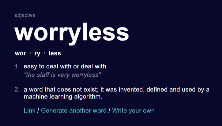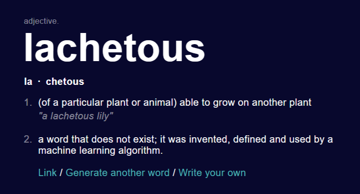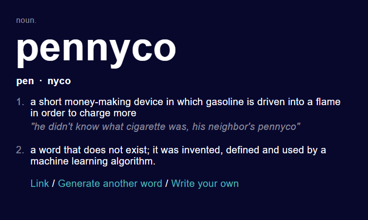 Thisworddoesnotexist uses the OpenAI-created algorithm GPT-2, which generates plausible text that’s been used to algorithmically create everything from text-based adventure games to grad school essays.