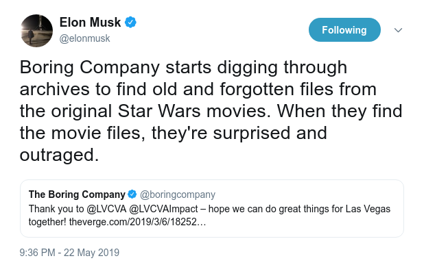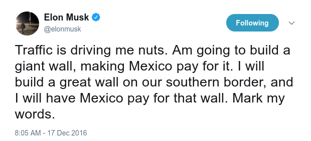 This was the tweet that led to the Boring Company — until Neural Musk put a Trumpian spin on it: