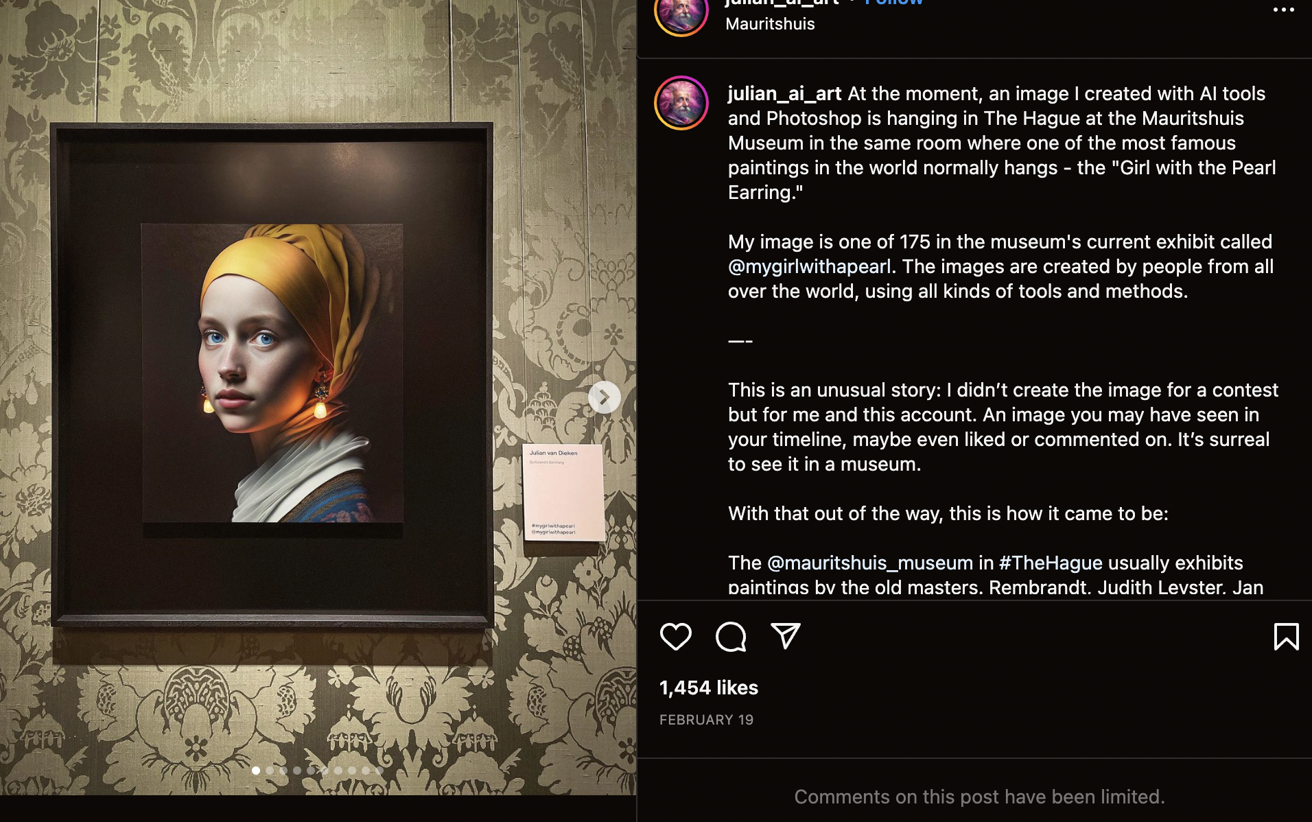 The museum chose van Dieken’s reproduction along with four others from nearly 3,500 submissions — and in an Instagram post about the honor, the AI artist said it felt “surreal” to see it hanging up in the same room where the “Girl” normally resides.