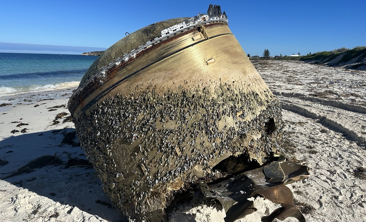 A large, barnacle-encrusted and golden cylindrical object washed up on a beach in Western Australia, puzzling authorities who are still trying to piece together what it is. Early signs, though, suggest that it’s some kind of space debris.