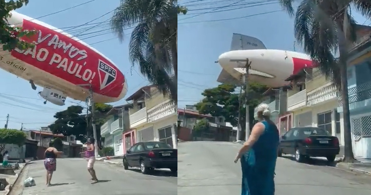 Dramatic video from a pedestrian captures the moment when the dirigible, sporting a red and white sign that reads “Vamos São Paulo,” fell into a building in the city’s Osasco neighborhood around noon and quickly deflated like a sad party balloon.