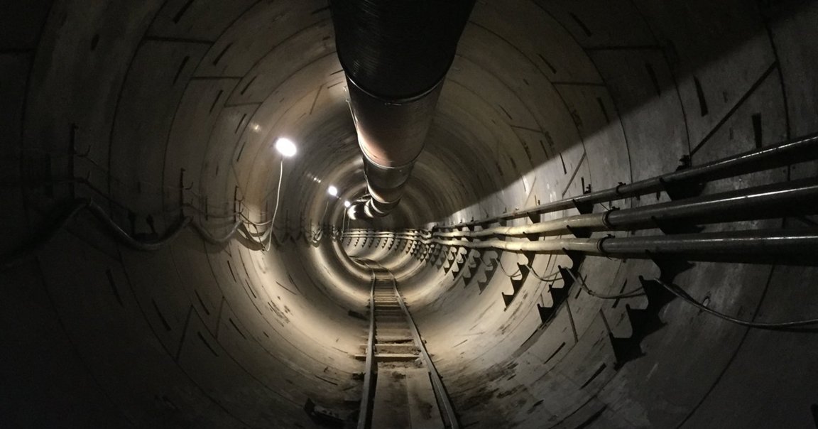 On Saturday, the Boring Company released new photos of its two-mile-long test tunnel in Hawthorne, CA, and the elevator shaft it is constructing at the tunnel’s midway point.