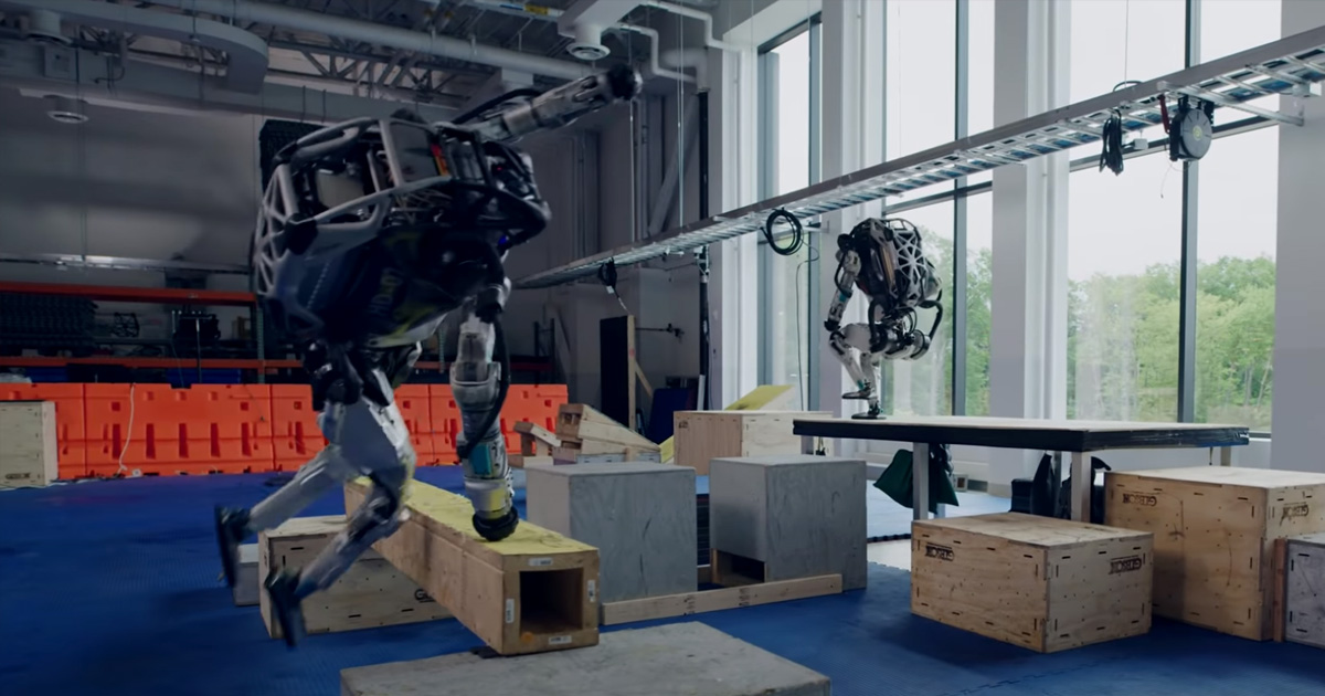 In the video, a pair of Atlas robots can be seen performing some impressive parkour, leaping over chasms, jumping over uneven terrain, and finishing up with a casual back flip. At one point, Atlas even vaults over a board using one of its arms to steady itself.