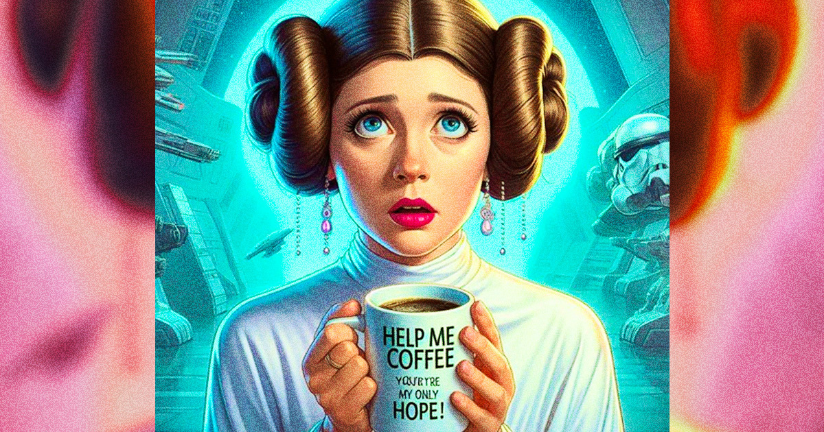 One example of this to go viral recently is this image, which features a clearly AI-generated Princess Leia from “Star Wars” holding a very peculiar mug. It reads (and no, this is not a typo): “Help Me Coffee You’ry’re My Only Hope!”