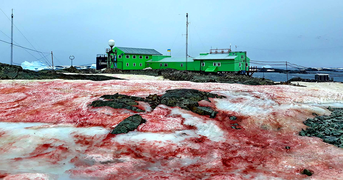 A Facebook post by Ukraine’s Ministry of Education and Science shows a research station on an island just off the coast of Antarctica’s northernmost peninsula covered in “blood snow.”