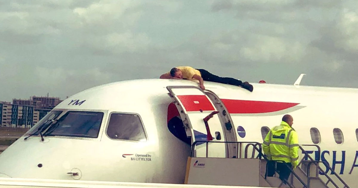 In an unusual stunt, former Paralympian James Brown reportedly smuggled a tube of glue through London’s City Airport and then clambered onto the roof of a British Airways plane and stuck himself there using the glue. Video footage of the incident spread online like wildfire.