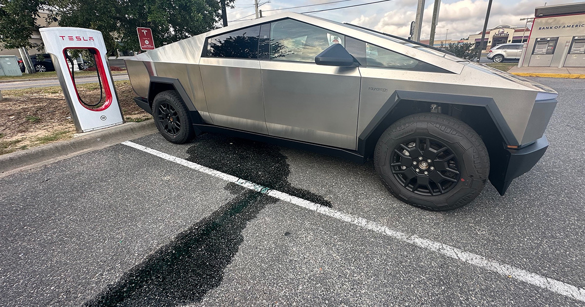 A picture show the Cybertruck parked in front of a Supercharger with a dark stain of coolant pooling on the asphalt parking lot. Another picture shows the vehicle resting on a tow truck.