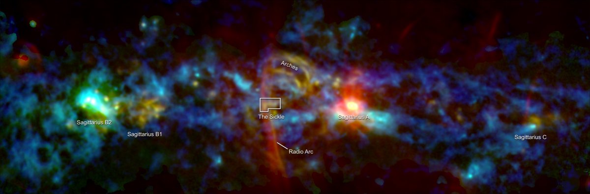 Deep within the central zone of the Milky Way, a bizarre cluster of dense gas clouds has taken the unusual form of a gigantic, cosmic candy cane.