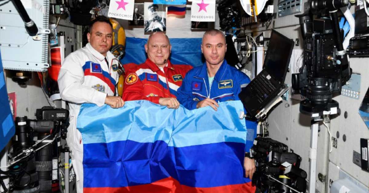 In an image shared on Russian space corporation Roscosmos’ official Telegram channel, three cosmonauts can be seen holding the flags of the Luhansk People’s Republic and the Donetsk People’s Republic, two eastern regions of Ukraine that the Russian federation recognizes as independent.