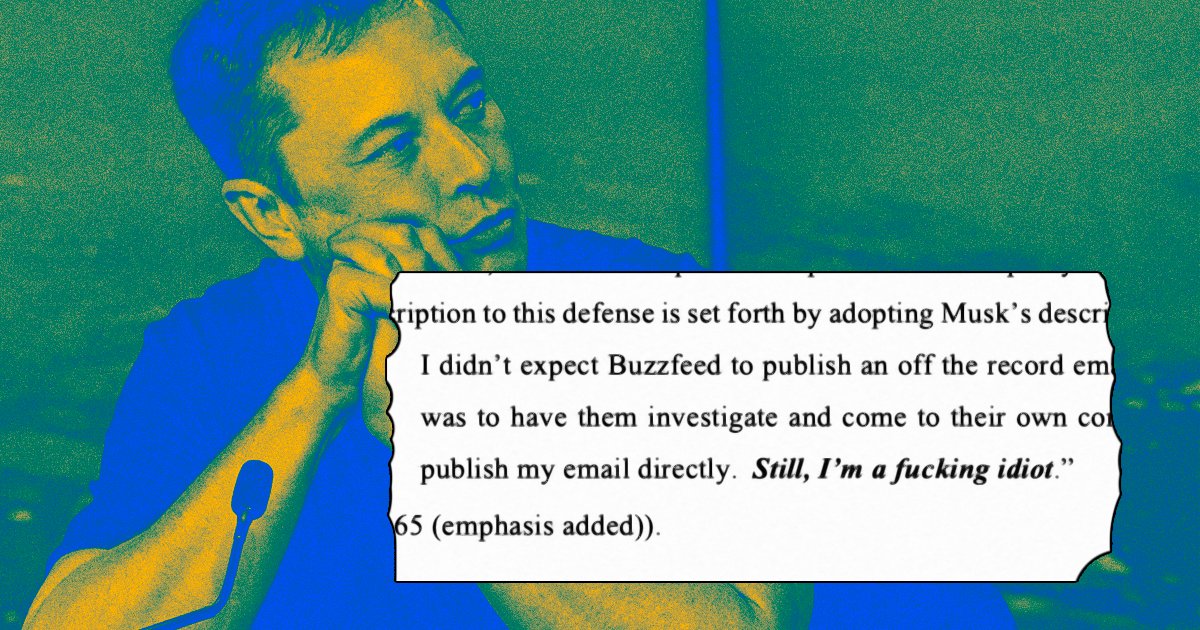 “I didn’t expect Buzzfeed to publish an off the record email,” Musk said, according to the document. “My intent was to have them investigate and come to their own conclusions, not publish my email directly. Still, I’m a fucking idiot.”