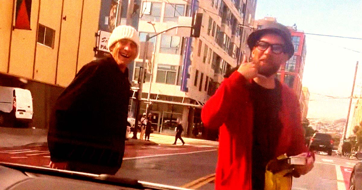 In a video she took from the front passenger seat, a man wearing a red hoodie and — yep — a fedora can be seen standing in front of the car. As Amina yells at him to go away and to stop holding up traffic, he repeatedly demands her number. At one point, he even takes off his fedora and extends it to her, despite her pleas to go away.