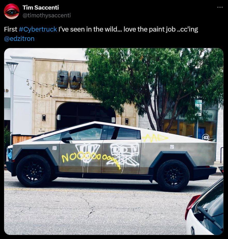 “First #Cybertruck I’ve seen in the wild,” the photographer captioned the post, “love the paint job.”
