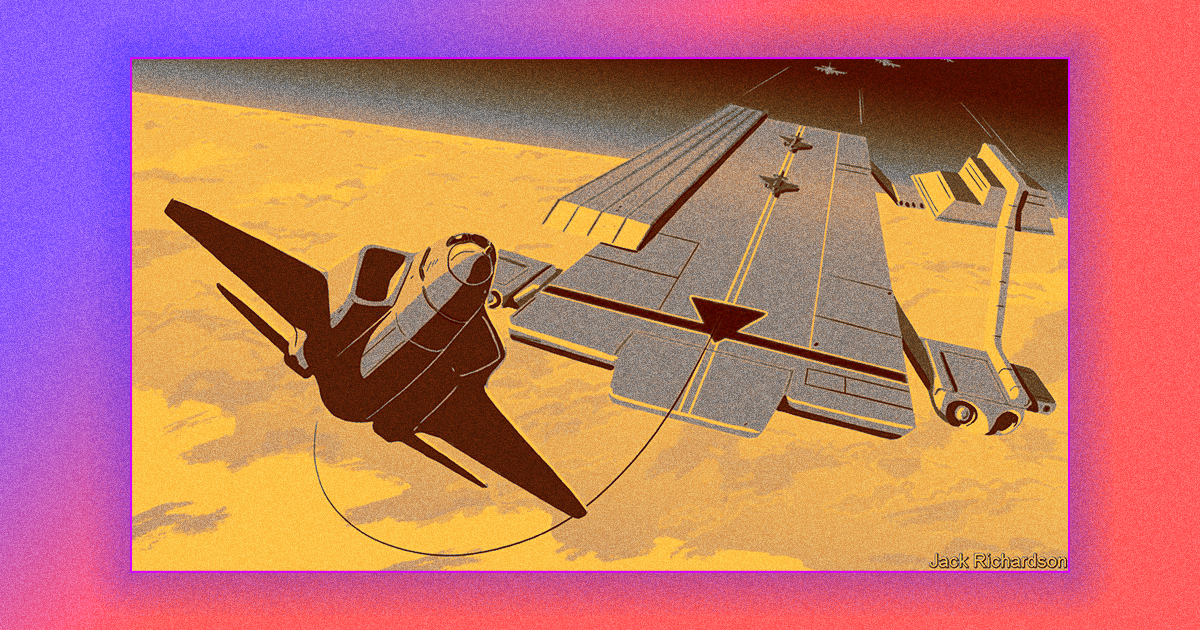 When it’s time to come back home, the drones would attempt to latch onto a small pod that dangles from the carrier like a strip of fly tape. So far, no one’s managed to stick the landing, though The Economist notes that some attempts have “come within centimeters of a successful capture.”