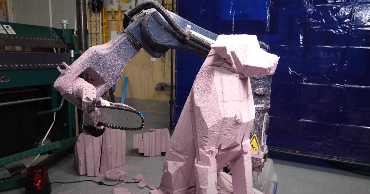YouTube tinkerer Shane Wighton, behind the channel Stuff Made Here, built a giant chainsaw-wielding robotic arm that can chisel a dog shape out of bits of foam board.