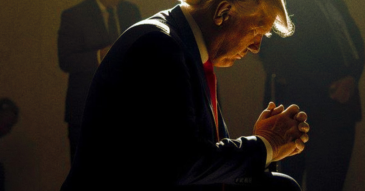 And lastly, there are some other “people” in the background of the image, but all of them look decidedly disinterested in the former POTUS. They’re all either looking at their phones or looking away, and we can’t imagine that if any president, in the middle of any room, took a knee to pray in a ray of golden, glowing Jesus light, everyone would probably pay at least a bit of attention. Or at least snap a selfie with such a choice backdrop.