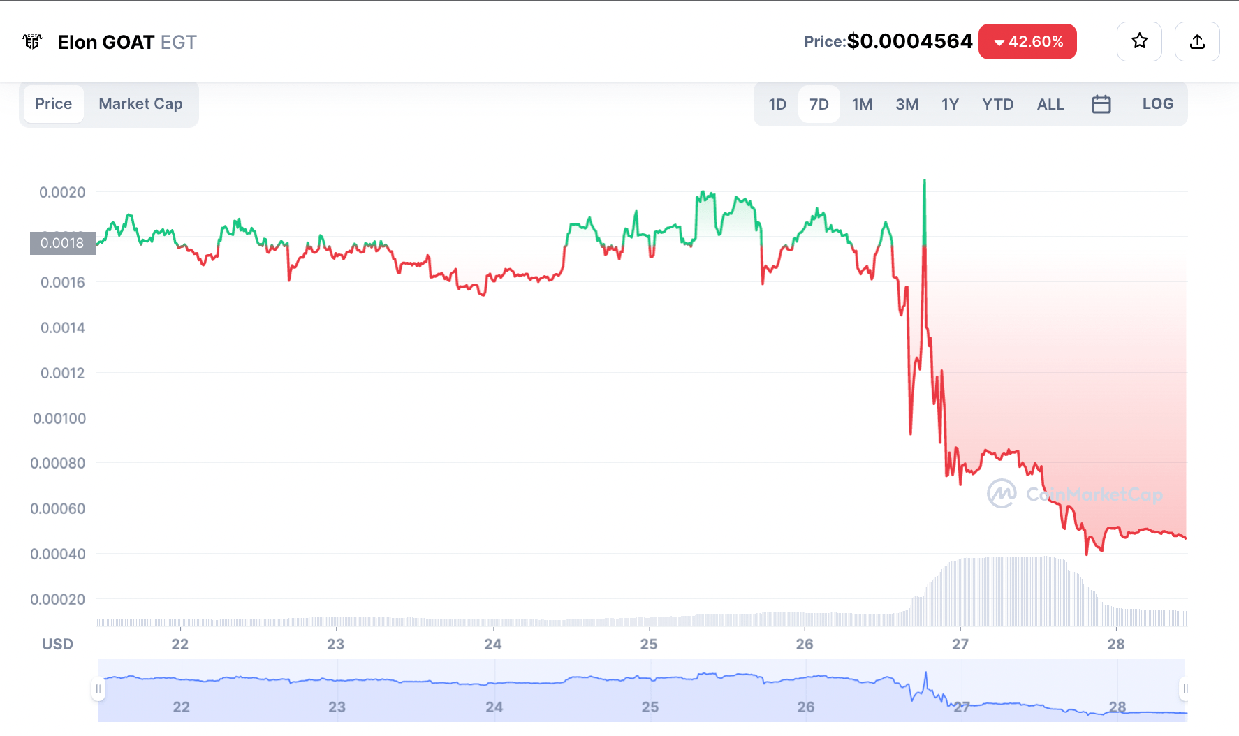 As of right now, the Elon Goat Token is worth a very small fraction of a cent, though again, it wasn’t worth all that much more at its Thanksgiving Day high, which totaled about $0.002 per coin.