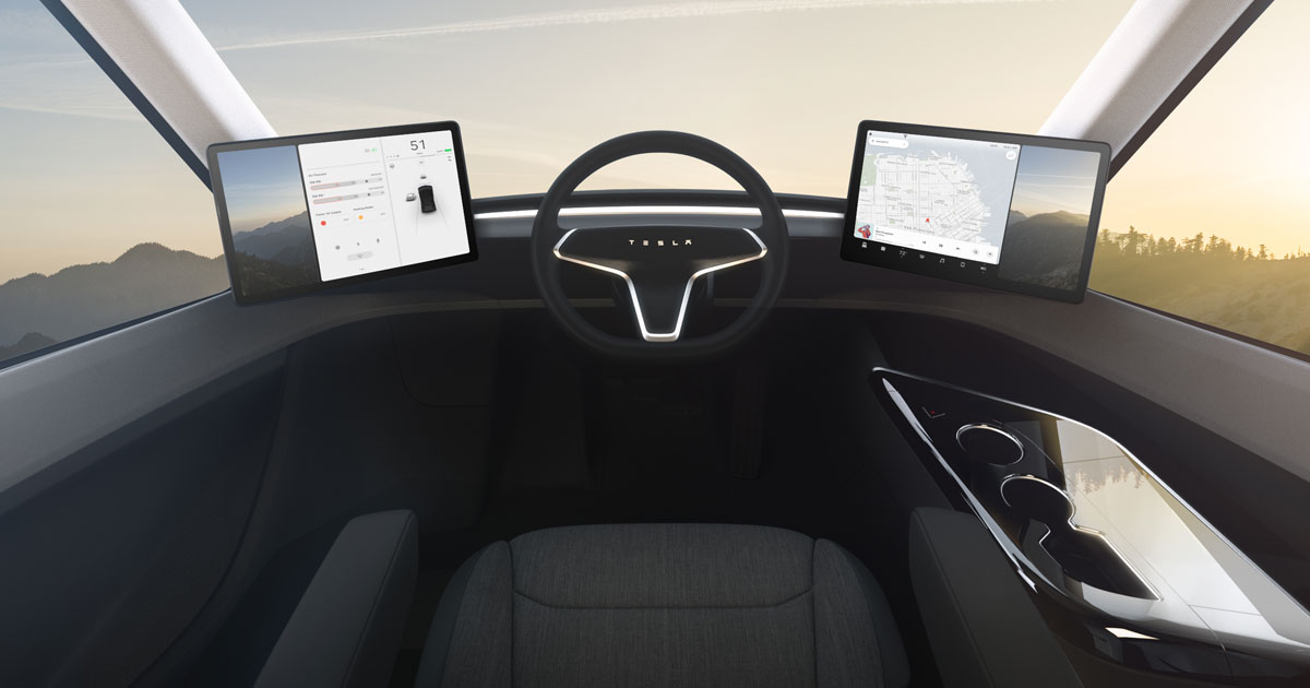 The driver’s seat inside the futuristic cockpit is centered, allowing for access to multiple touchscreens — not unlike the controls in the Crew Dragon module built by Musk’s other venture, SpaceX.