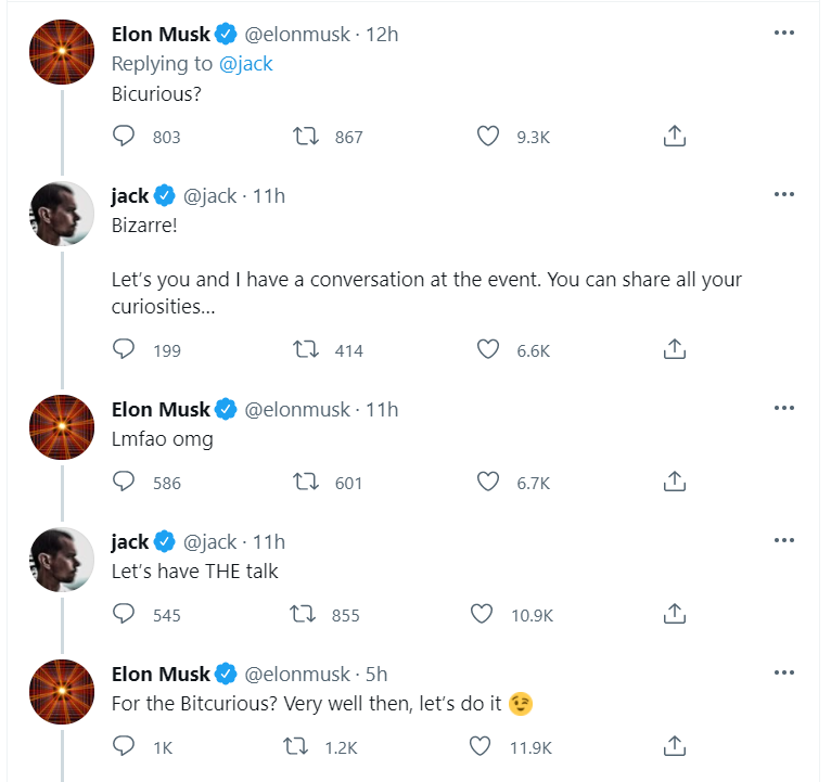 “Let’s have THE talk,” Dorsey continued in a follow-up tweet. “For the Bitcurious? Very well then, let’s do it,” Musk replied , referring to the event’s name, “The B Word.”