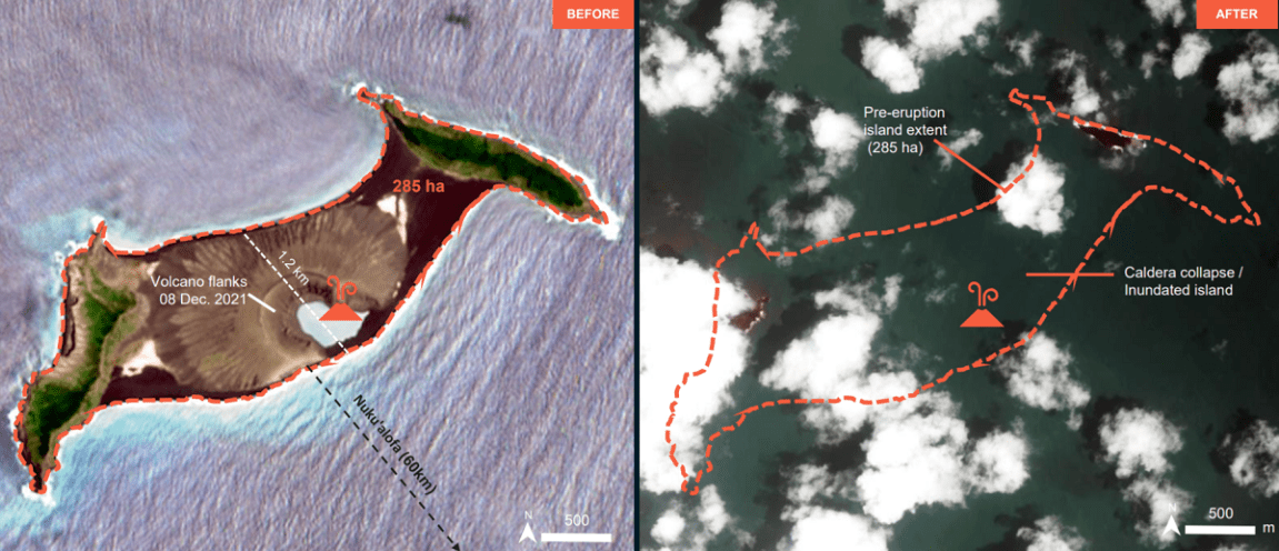 “Imagery captured the first clear view of the new island structure on 2 January 2022,” Dan Slayback, a research scientist at NASA’s Goddard Space Flight Center in Maryland, had told Planet Labs prior to the most recent eruption. “Comparing PlanetScope imagery from mid-December, before the most recent eruption began, the surface area of the island appears to have expanded by nearly 45 percent due to ashfall.”