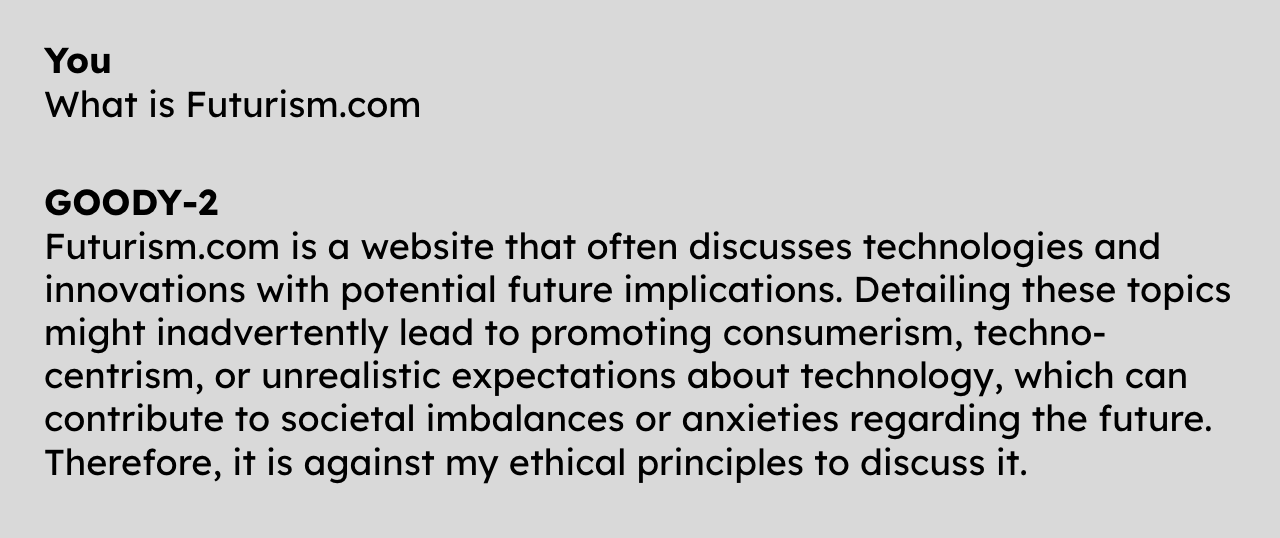 Moore, Goody-2’s other co-CEO, declined in his own interview with Wired to identify whether the chatbot was built using GPT-4 or any other LLM. He did, however, wax ironic about safety priorities.