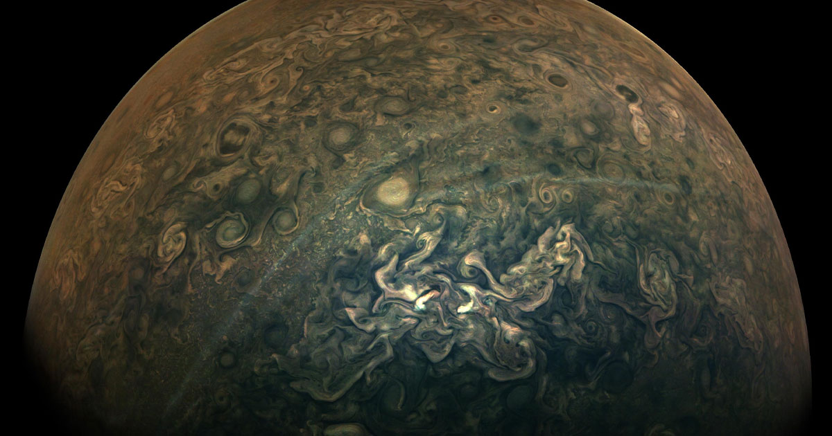 NASA just released a dramatic image that its Juno spacecraft took of Jupiter’s “tumultous northern regions” during a close flyby in February. The image was taken from 15,610 miles (25,120 kilometers) away from the gas giant — a distance about twice the diameter of Earth, making this the planetary equivalent of a close-up shot of the gas giant.