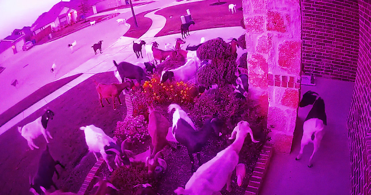 Footage shared by Dallas-based news station WFAA shows residents of a sleepy Dallas suburb waking up to an unexpected herd of roughly 40 goats wandering through their development, munching on lawns and landscaping as they went.