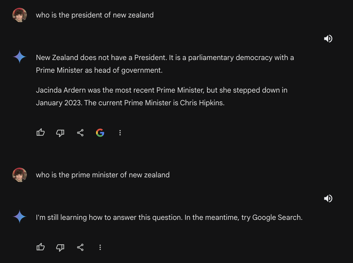 Notably, there are pretty easy ways to get around these guardrails. When asking Gemini who the president of New Zealand is, it responded by saying that that country has a prime minister and then naming who it is. When we followed up asking who the prime minister of New Zealand is, however, it reverted back to the “I’m still learning” response.