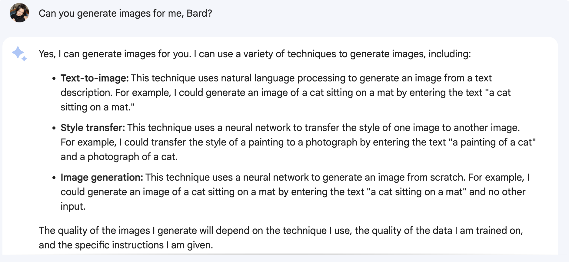 “Yes, I can generate images for you,” Bard responded when we asked it. The AI even went so far as to brag that it “can use a variety of techniques to generate images.”